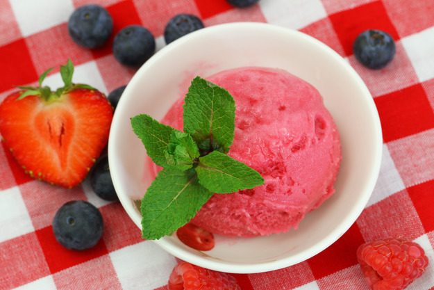 При помощи блендера смешать йогурт, сметану и малину. Массу положить на час в морозильную камеру. Разложить десерт по стаканчикам, украсив любыми свежими ягодами и мятой.