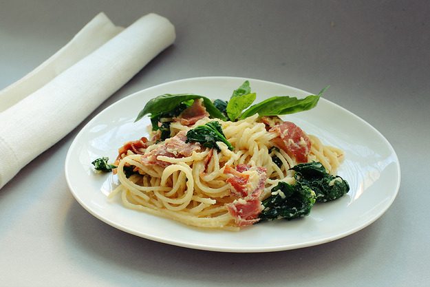 Спагетти карбонара в самом утонченном варианте: нежная ветчина, припущенный шпинат для зеленого акцента и сочности, вкуснейший соус из рикотты, выдержанного пармезана и желтка.