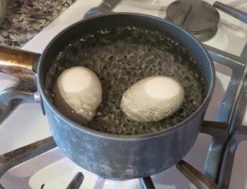 Интересно, что в американских кулинарных книгах и блогах обычно предлагается немного другая технология варки яиц вкрутую, чем та, к которой мы привыкли.Итак, заливаем яйца в кастрюльке холодной водой так, чтобы она полностью покрывала яйца. (Я еще добавляю в воду по русской привычке немного соли, чтобы, если какое-то яйцо треснет, оно все оставалось бы в скорлупе.) Ставим кастрюльку на огонь, доводим до кипения. После этого сразу выключаем воду (!!!), накрываем кастрюльку крышкой и полотенцем и оставляем на 12-15 минут, в зависимости от величины яиц.