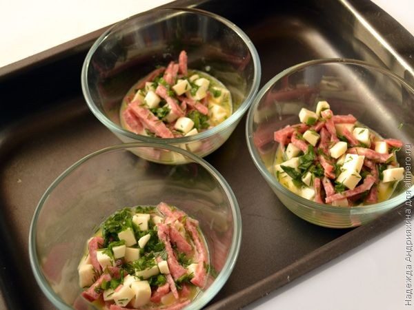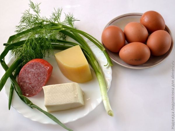 Ингредиенты (на три порции): 5 яиц, 50 г мягкого сыра (козьего), 50 г твердого сыра, 50 г варено-копченого сервелата, зеленый лук, укроп, петрушка.