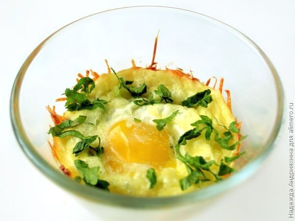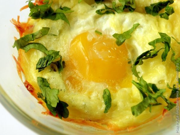 Дальше в каждую порцию разбивается яйцо так, чтобы желток оказался в центре. Края (белок) засыпаем натертый мелкой стружкой твердый сыр. Ставим формочки запекаться в духовку. Температура обычная – 180 градусов, время — около 15 минут.