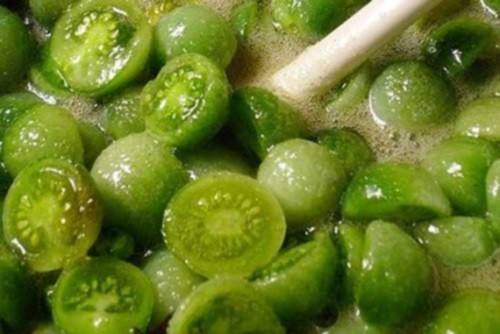 Считается, что выбирать для консервирования следует наиболее крупные зеленые помидоры, а для лучшего результата их следует замачивать перед консервированием на 6 часов в соляном растворе, каждые 2 часа его меняя.