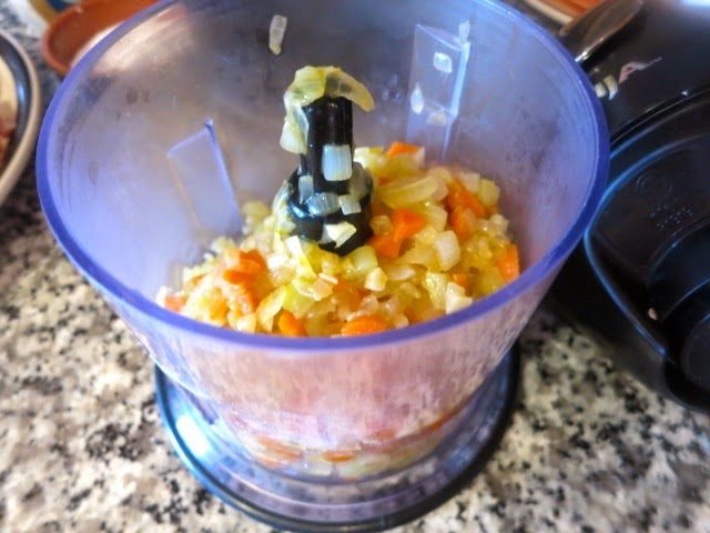 Немного остужаем овощи и кладем их в маленький кухонный комбайн.