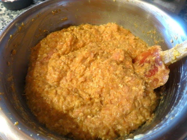 Добавляем к фаршу яйцо, пюрированные овощи, набухшие овсяные хлопья, соль и перец. Хорошо перемешиваем.