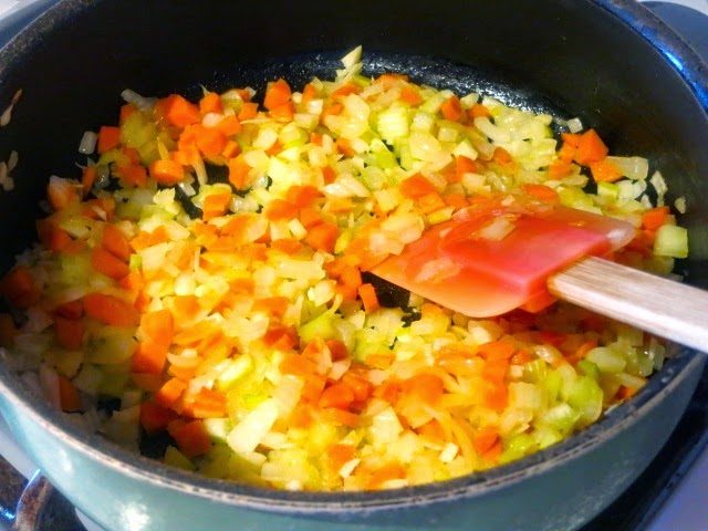 Лук и морковь режем мелкими кубиками. С внешних сторон черешков сельдерея удаляем грубые волокна. Нарезаем сельдерей мелкими кубиками. Чеснок рубим очень мелко.