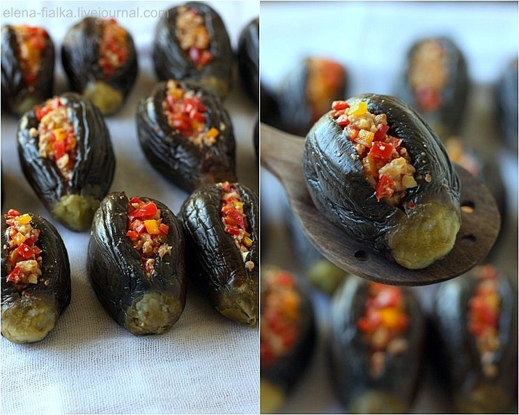 Утром в каждом баклажане с боку сделать надрез(не в коем случае не разрезать попалам, просто надрез с боку).Положить начинку во внутрь.