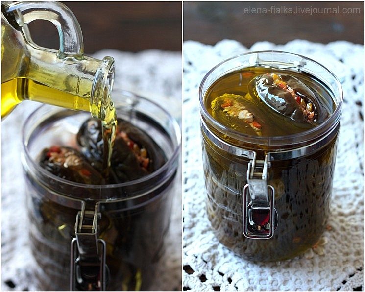 После не переворачивая банки, открыть крышки и вылить рассол.Перевернуть банки.Налить хорошее оливковое масло.