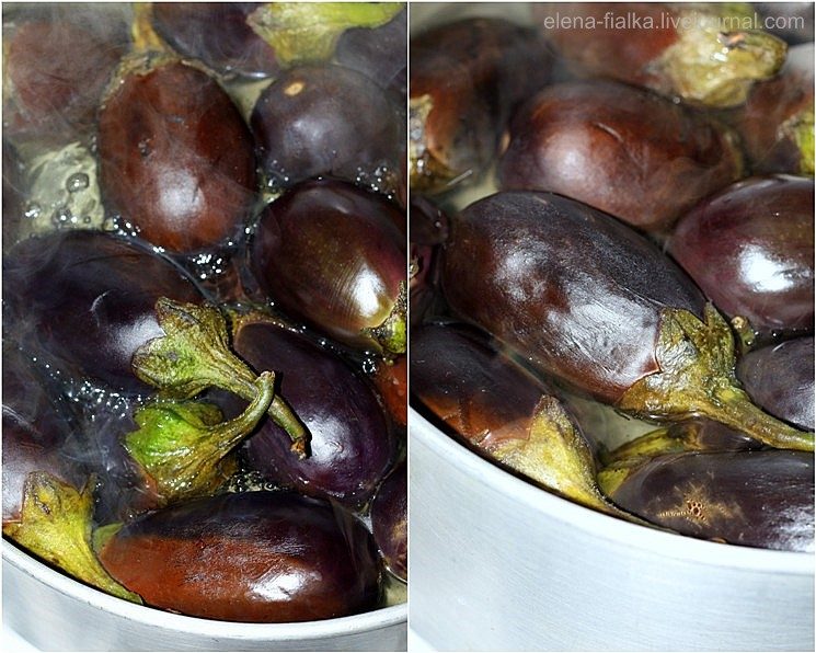 Баклажаны помыть.Закипятить в большой кастрюле воду, соль не добавлять.Положить к кипящую воду баклажаны и готовить их 7-10 минут.Здесь главное не переварить баклажаны, поэтому готовить их не больше 10 минут, они должны быть лишь слегка мягкими на ощупь.Откинуть баклажаны на большое сито и сполоснуть холодной водой.