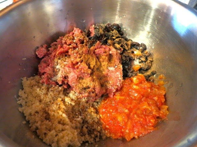 В миске соединяем оба вида фарша, распаренный булгур, изюм, треть тушеных овощей, корицу, душистый перец и гвоздику. Солим и перчим по вкусу, добавляем примерно четверть стакана бульона и хорошо перемешиваем.