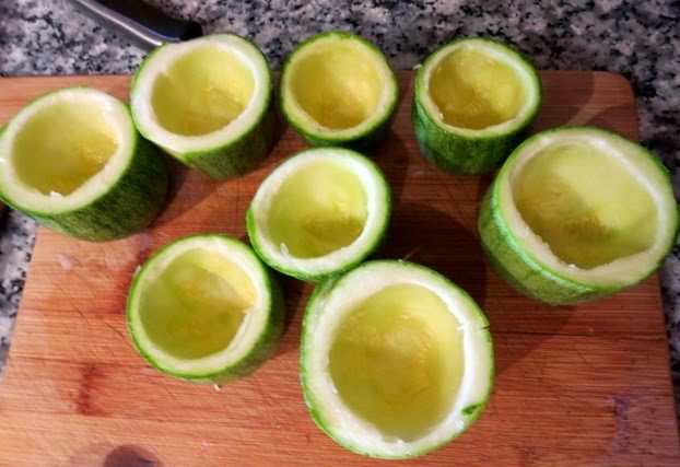 Чайной ложкой аккуратно выскребаем из кабачков мякоть, оставляя стенки толщиной примерно 5 мм.