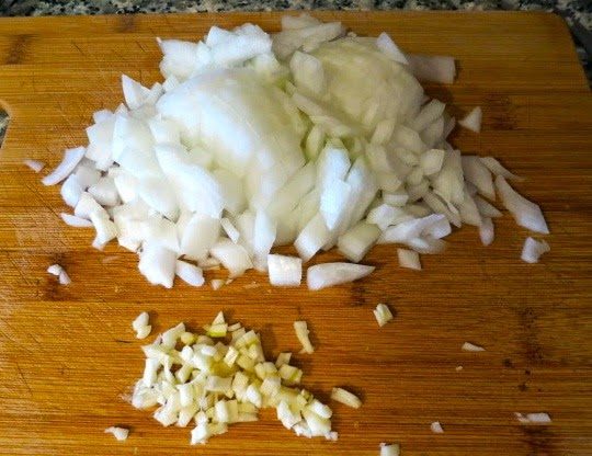 Лук режем мелкими кубиками. Чеснок рубим очень мелко.