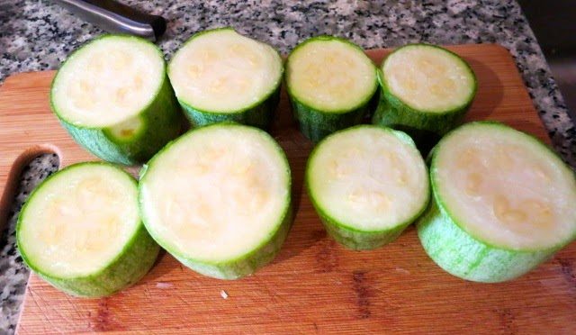 Кабачки разрезаем поперек, каждый на две части. Донышки подравниваем ножом, чтобы кабачки могли стоять в форме для запекания.