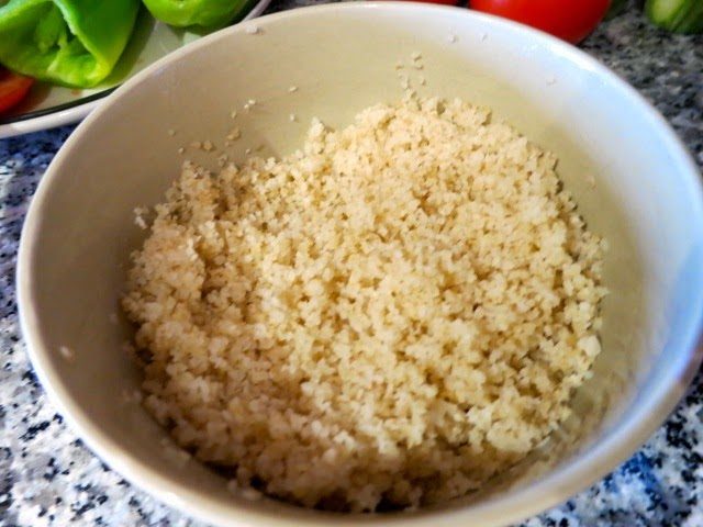 Булгур заливаем в плошке кипятком из чайника. Накрываем плошку пластиковой пленкой и оставляем на полчаса. Взрыхляем булгур вилкой и остужаем до комнатной температуры.