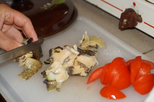 А вот содержимое раковин нужно хорошенько вымыть и почистить, удалить твёрдую крышечку, которой рапан закрывался в ракушке и удалить все внутренности… всё, что можно отделить от мяса… Вообще, мясо рапана — это нога, при помощи которой моллюск крепится к поверхности, передвигается и т.д. Именно она нам и нужна… отходов получается много, процентов 40… кто-то ещё срезает и чёрную часть… а я не стала Получается как-то так…
