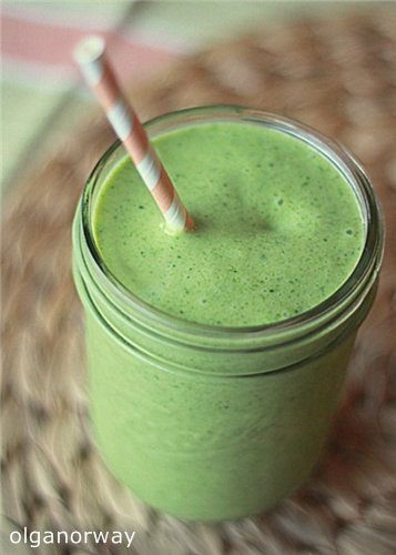 1.Смешать в блендере шпинат, персики, бананы и ананасы.