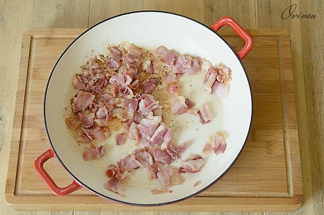 Добавляем в брынзу молоко. Хорошо размешиваем и поливаем им галушки. Сверху раскладываем бекон и чуток зелени.