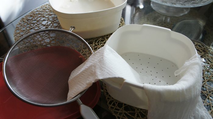 Вот дальше и случился со мной конфуз. Я взяла сито, выстелила его марлей и вылила приготовленную смесь… которая благополучно протекла в кастрюльку. Правда консистенция получилась прекрасной. Пришлось с начала на сито положить плотную бумажную салфетку, на нее марлю и уже потом ряженку.