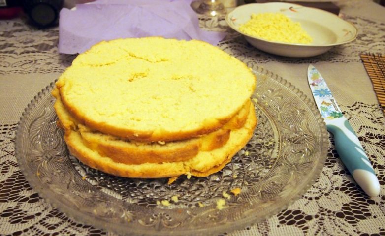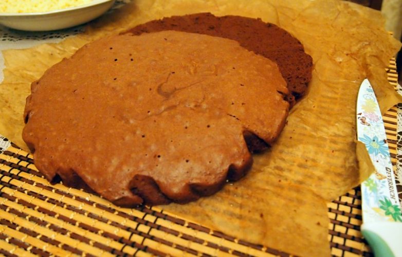 Готовые коржи разрезаем, белый на 3 части, шоколадный на 2.