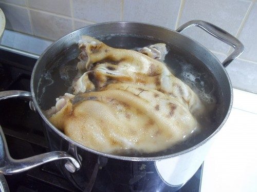 Ушки хорошо очистите и поскребите скребком в ушных отверстиях. Положите уши в кастрюлю, залейте водой и поставьте вариться.