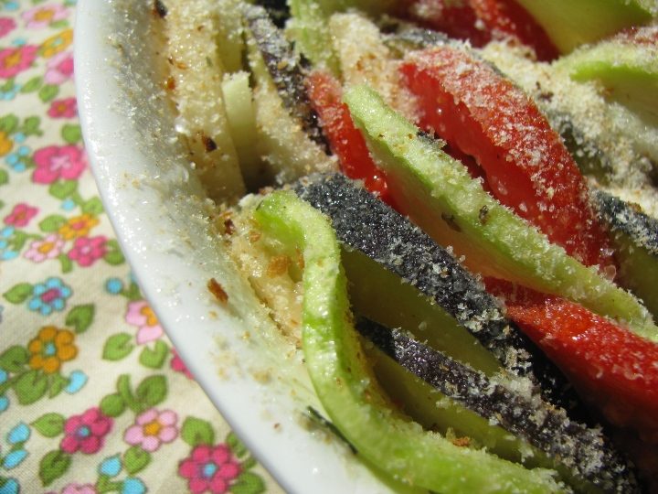 Все овощи, кроме помидоров и лука, сложить в большую миску, заправить оливковым маслом, чесноком, травами, посолить, поперчить, посыпать панировочными сухарями, и очень аккуратно перемешать, чтобы все овощные пластинки пропитались заправкой.