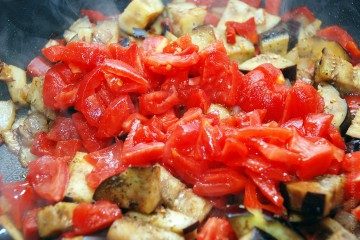 Густые горячие рагу из овощей прекрасно могут сочетаться с итальянской пастой. Если соединить пасту с овощным соте из баклажанов (лука, помидоров, перца), получится отличное сытное блюдо — паста с баклажанами и помидорами.