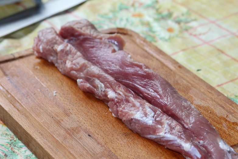 1. Вырезку зачистить от пленок. Сделать по всей длине глубокий надрез, не доходя до края, примерно 1 см. Раскрыть вырезку как книжку.
