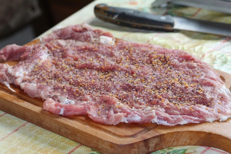 2. Вырезку отбить, посолить, поперчить и посыпать приправой.