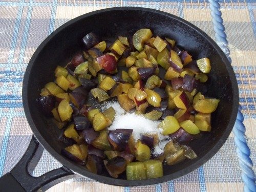 В сковороду положите масло и растопите его. Затем отправьте в нее жариться сливы с сахаром.