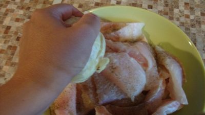 2. Выкладываем филе рыбы в мисочку, туда же выдавливаем из одного лимона сок (если планируете «пустить» цедру лимона на приготовление, к примеру, манника, то сначала «уберите» ее с помощью терки — выдавливайте сок только из мякоти лимона). Добавляем соль и перец по вкусу. Все тщательно перемешиваем. Рыба будет мариноваться (как я уже говорила) — минут 20.