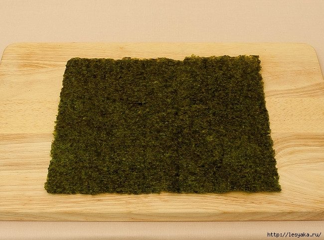 Лист нори положите на сервировочную тарелку (или в разъемную форму) шероховатой стороной вверх.