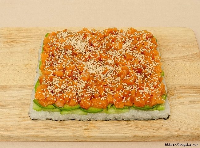 А теперь повторите все слои: нори, огурцы, авокадо, рыба, кунжут. Украсьте торт по своему вкусу. Из имбиря можно свернуть розочки и украсить их васаби, из огуречной кожуры нарезать стебельки.