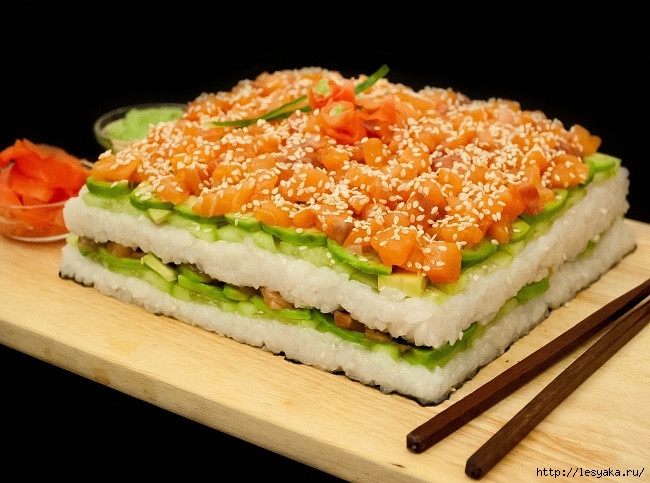 Для сворачивания суши и роллов требуются определенные навыки и опыт. А суши-торт готовится гораздо проще и быстрее.