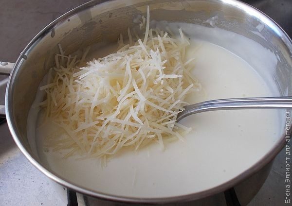 Снимаем бешамель с огня и добавляем к нему половину натертого пармезана. Солим и перчим по вкусу.
