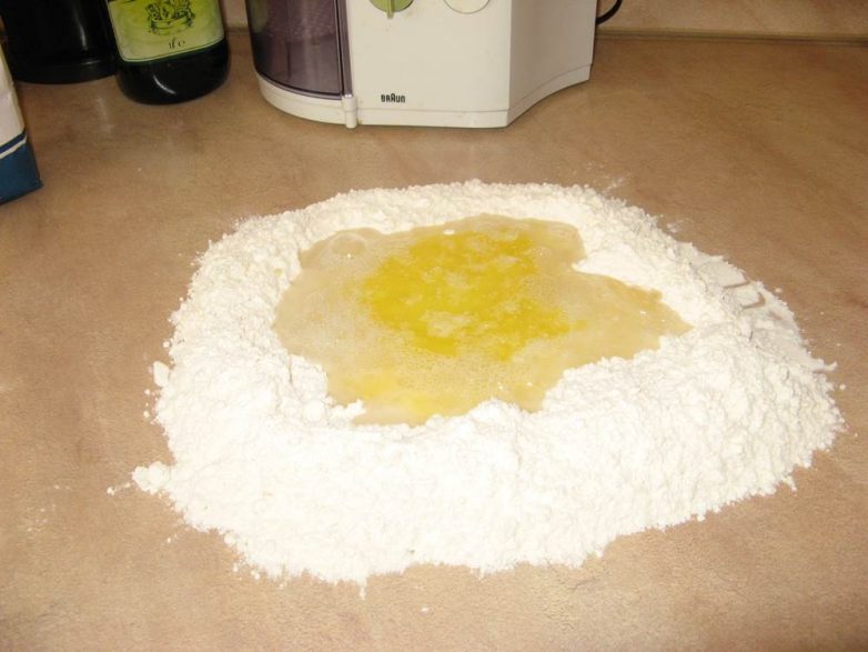 Когда фарш готов, можно заняться тестом. Оно почти как на пельмени, только добавляю столовую ложку топлёного сливочного масла. Мне кажется, что именно от него при жарке тесто в крымских чебуреках начинает красиво пузыриться.