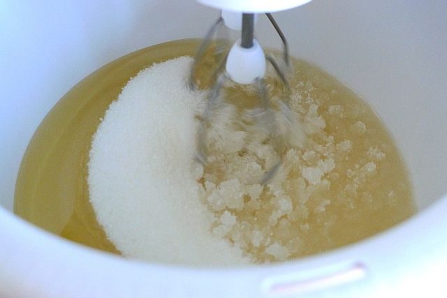 Взбить вместе растительное масло и сахар.