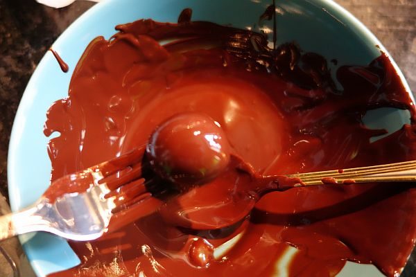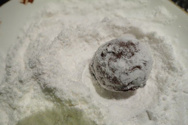 8.Стряхиваю шоколад, и осторожно укладываю конфету в сахарную пудру.