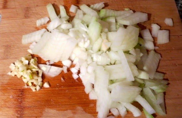 Готовим мясной соус. Лук режем мелкими кубиками. Чеснок рубим очень мелко.