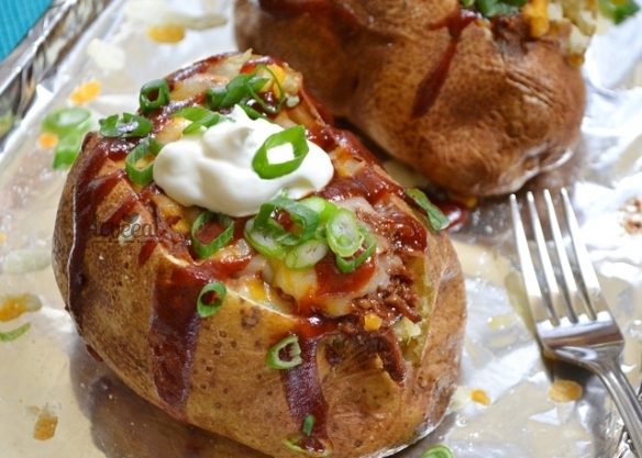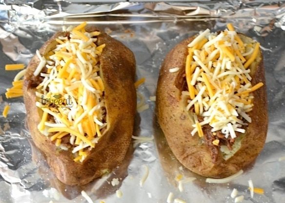 Удобное и оригинальное блюдо — фаршированный мясом картофель, запеченный с сыром. Посыпьте зеленым лучком, полейте сметаной и острым соусом для барбекю, и наслаждайтесь! Кстати — неплохой вариант для пикника!