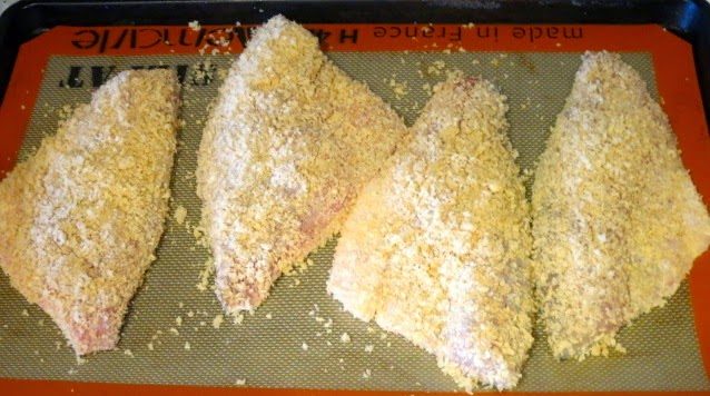 Обваливаем рыбное филе в панировке. Руками плотно прижимаем слой панировки к рыбе. Укладываем филе на противень, застеленный смазанной фольгой или силиконовым ковриком.