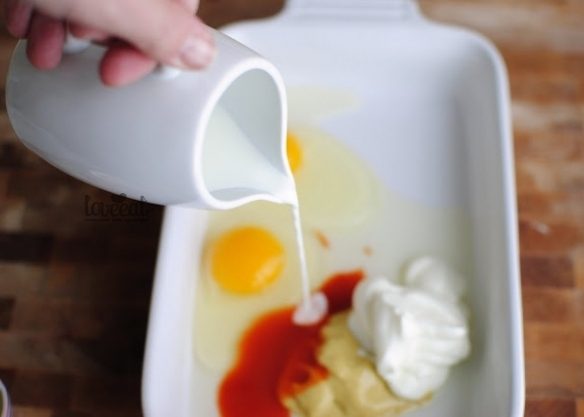 Разогрейте духовку до 220 градусов. В небольшую посуду поместите горчицу, греческий йогурт, острый соус и яйца.