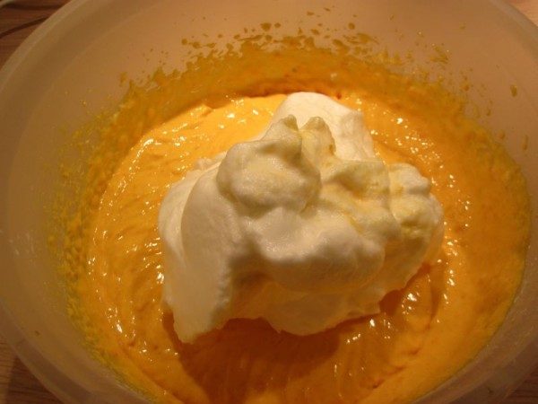 1. В миску кладем тыквенное пюре, творог, сахар, порошок пуддинга и пекарский порошок. Разделяем яйца: белки в чистую, пустую емкость, желтки — к творогу и тыкве.