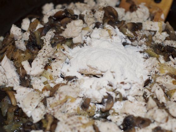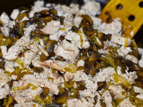 Добавляем к нашему луку грибы, курицу, перчим. Если надо – подсаливаем. Получается вот так (уже выглядит аппетитно):