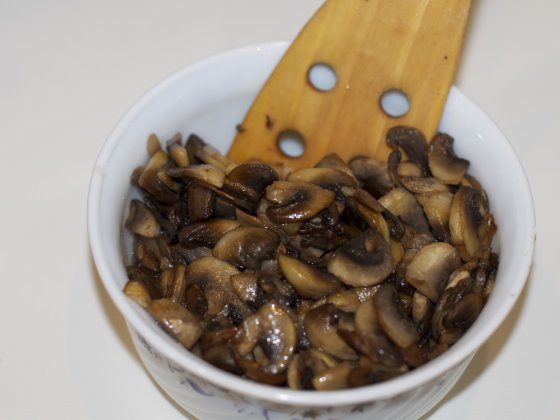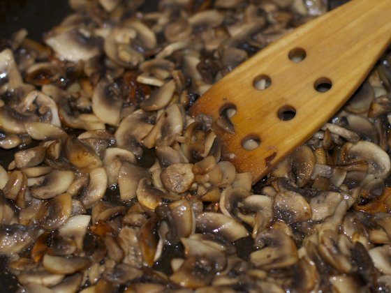 Пока курочка (вернее, еë лучшая часть :) варится, моем или чистим шампиньоны (кто как привык). Затем режем грибы пластинками как на фото: