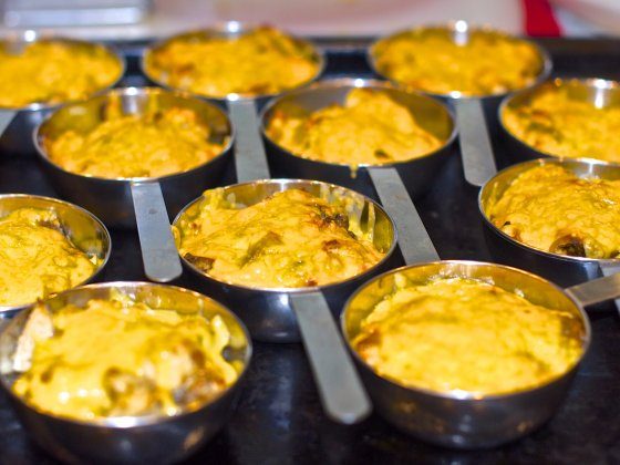 Затем берем наши 12 кокотниц или керамические горшочки. Мне кажется, в кокотницах получается как-то аппетитнее и оригинальнее. Штуки это недорогие, можно купить в Metro по 250 рублей за 6 кокотниц. Выкладываем нашу смесь. Посыпаем тертым сыром. На фото две кокотницы – одна еще без сыра, а вторая – готова к отправке в духовку: