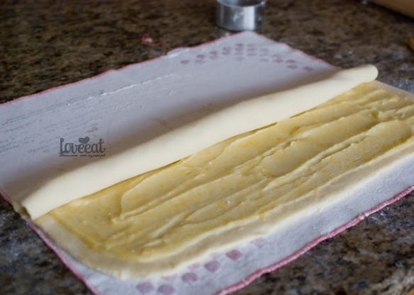Теперь разрежьте ролл на 24 равных части. Это проще делать следующим образом: разрежьте ролл пополам, затем каждую половинку — снова пополам, и так, пока не получится 24 булочки!