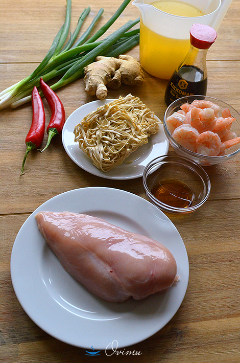 Для него нам понадобиться: куриная грудка без кожи, очищенные креветки ( желательно хвосты), 2 ст. ложки кунжутового масла. 30 грамм имбиря, стручек свежего красного острого перца, зеленый лук и 700 грамм бульона (овощного или мясного), лапша