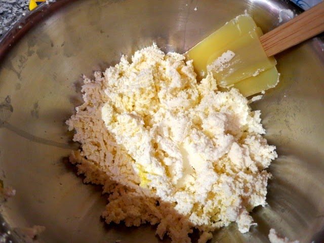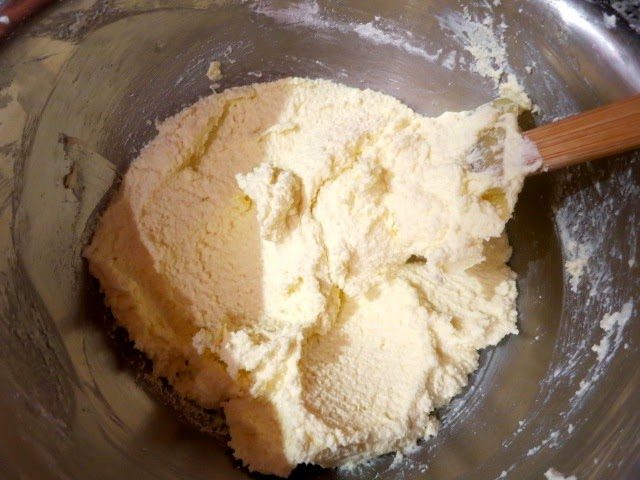 Добавляем к творогу яичный желток, соль, сахар или сахарную пудру и растопленное сливочное масло. Перемешиваем. Если начинка выглядит жидкой, добавляем крахмал.