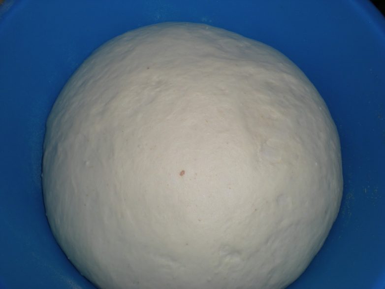 Поставьте тесто в теплое место, затянув пленкой, чтобы оно поднялось в два раза. Через полчаса с начала подъема тесто нужно обмять путем складывания.