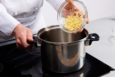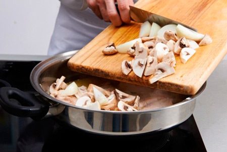 Репчатый лук нарезать дольками, грибы — ломтиками и добавить к тушеному кролику. Добавить ароматные травы и чеснок, немного соли и перца, закрыть крышкой. Готовить фрикасе на минимальном нагреве примерно час, до мягкости кролика.