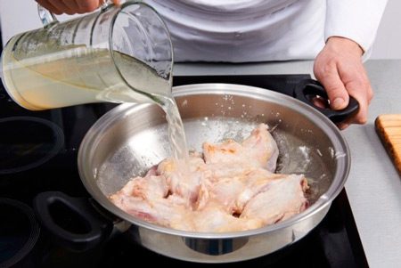 Обжаренное мясо кролика посыпать мукой, перемешать, влить вино и довести до кипения, влить куриный бульон. Довести до кипения, снять пену и готовить 15-20 минут под закрытой крышкой.